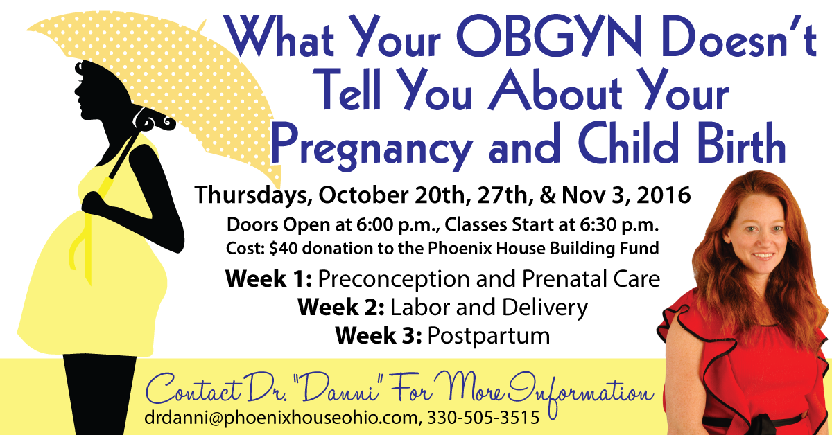 Doctor Dannielle MacDuff is offering a three-week course for women who are, or are thinking about becoming pregnant entitled "What your OBGYN Doesn't Tell You About Pregnancy and Childbirth". This course takes place at Trumbull Career and Technical Center, 528 Educational Highway, Warren OH 44483 on October 20th, 27th, and November 1st. Classes begin at 6:30pm. The entire course costs a $40 donation to the Phoenix House Building Fund.