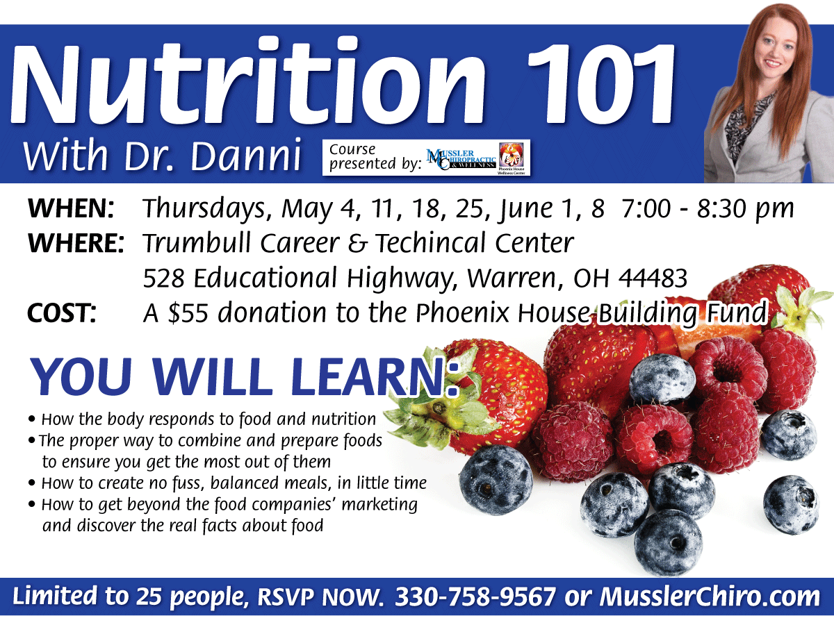 Dr. Danni is starting her next course very soon! Entitled "Nutrition 101", the course lasts six weeks on Thursdays, May 4, 11, 18, 25, June 1 & 8 from 7:00 to 8:30 PM. It will be held at Trumbull Career and Technical Center, 528 Educational Highway, Warren, OH 44483. This course is limited to 25 people.