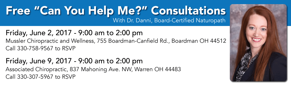 Join her at her Boardman office inside Mussler Chiropractic, 755 Boardman-Canfield Rd. Boardman OH 44512 on Friday, June 2, 2017, from 9:00 am to 2:00 pm. Call 330-758-9567 to RSVP.